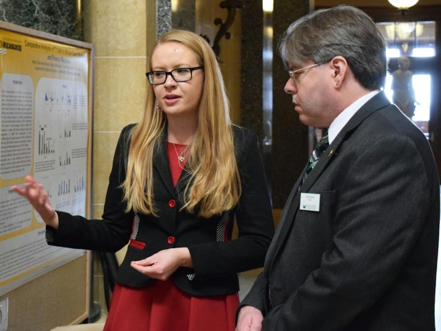 By Jake Skubish | Apr. 14, 2016Students and community members marched from Library Mall to Bascom Hall Wednesday, protesting the lack of a living wage for student workers and demanding the elimination of student debt, among other issues.