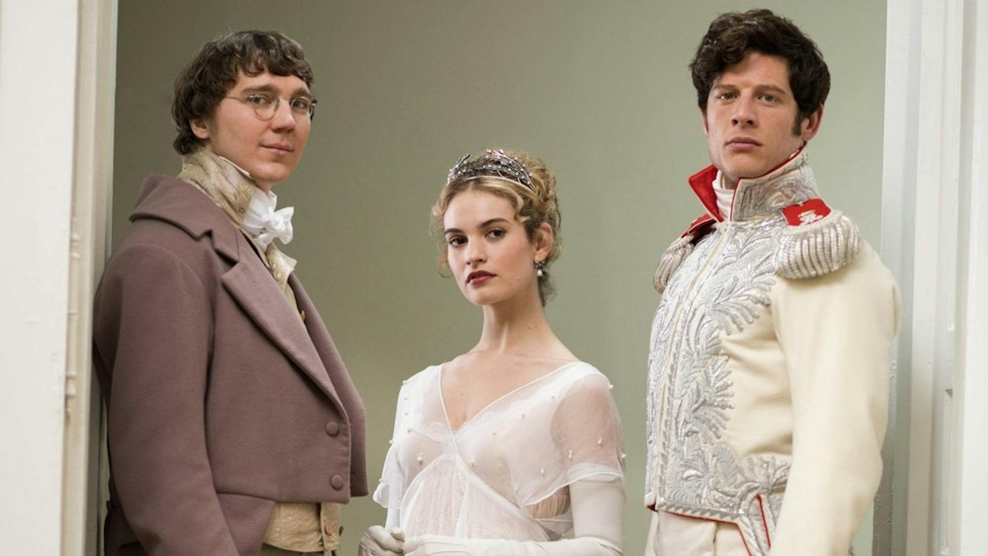 The gut-wrenching love triangle between characters Natasha, Andrei and Pierre is proven to be the heart of the series. Natasha (Lily James) symbolizes purity with an always-optimistic outlook on life. Andrei (James Norton) embodies war with a torturous death complex. And Pierre (Paul Dano) is peace, an existentialist constantly seeking pacifism. The acting is at times subtly delicate, and other times brutally severe. For instance, while Andrei is writing a faux-heartfelt letter to his sister, father and pregnant wife, he grimaces to himself, “I would give it all up for a chance at glory.” Yet, once he falls for Natasha, the happiness spreads through him. Love transforms Andrei into a different man than he once was. Natasha is a beacon of purity, hope and naivety shining in a desolate expanse of a bleak future tainted by war. There is a scene in which Natasha and Andrei dance at the immaculate Catherine Palace for the Tsar’s Ball. While watching this exquisite montage, it is easy to feel like you are there with them, swept up in the moment. When Pierre advises Andrei to marry Natasha, the pain, envy and love is evident in Pierre’s eyes.