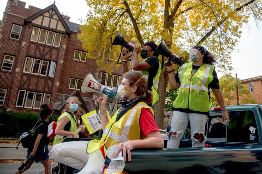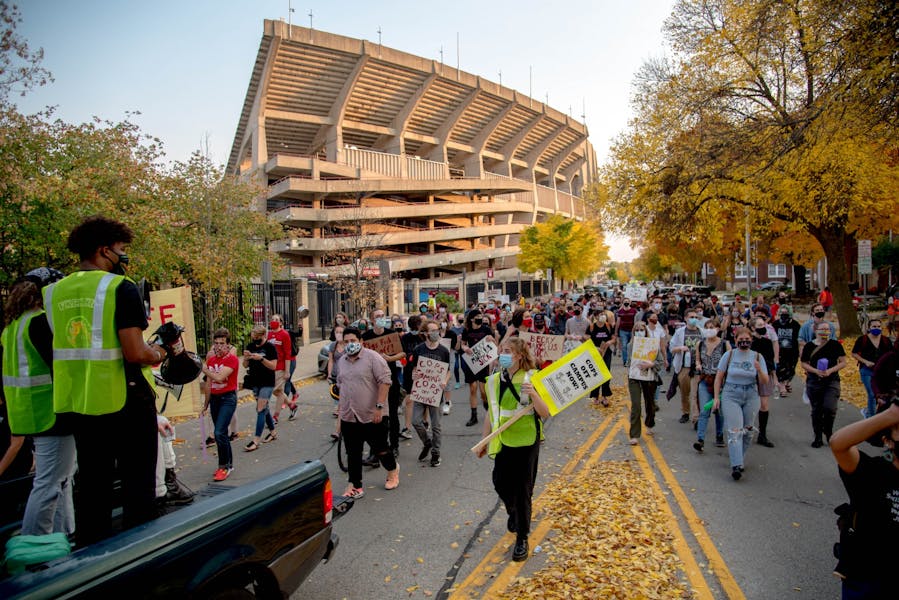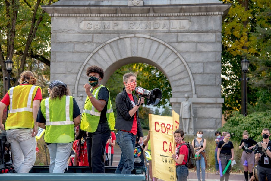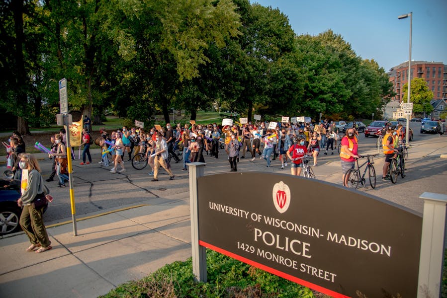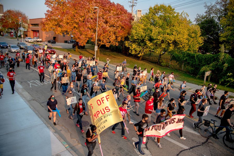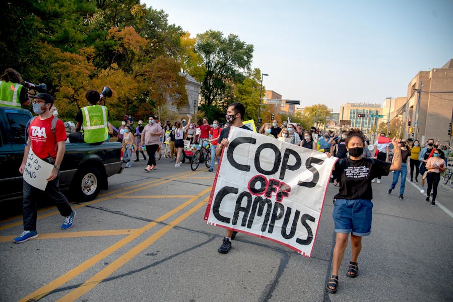 Scenes from an Oct. 9 march organized by the UW BIPOC Coalition and TAA to call for racial justice and a police-free campus. Students marched from Camp Randall stadium to the UWPD headquarters and the Chancellor's mansion.
