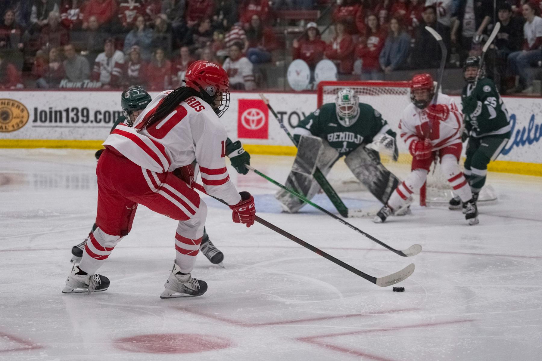 SLIDESHOW PHOTOS: The No. 1 Wisconsin Badgers women's hockey team defeated the Bemidji State Beavers 7-0 on Friday before eking out a 3-2 overtime victory on Saturday to advance to the WCHA Final Faceoff.