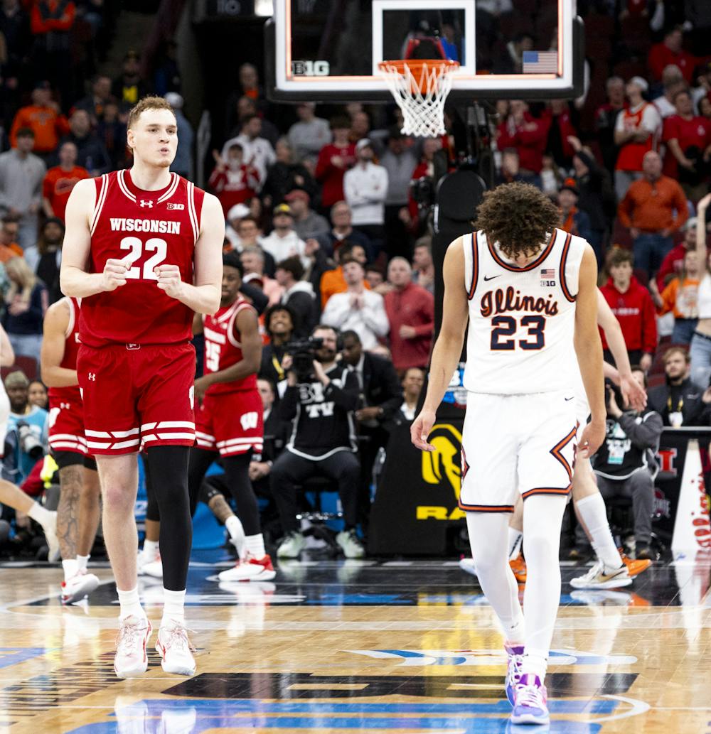 Austin Rapp celebrates his victory as Keaton Wagler looks down in despair following the Wisconsin men's basketball team's 91-88 overtime victory over Illinois to advance to the semifinal of the Big Ten Tournament on Friday, March 13, 2026.