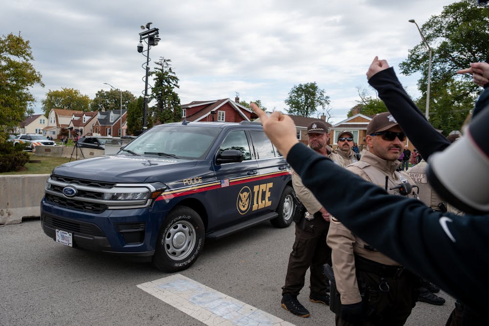 Anti-ICE protestors flip off an ICE patrol car as it pulls into the Broadview detention center on Oct. 10, 2025.