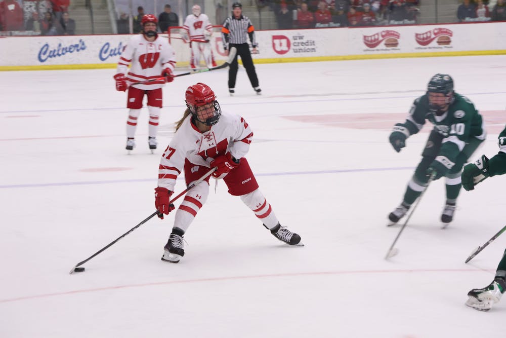 Forward Kirsten Simms loads up a shot during No. 1 Wisconsin women's hockey's 3-2 series clinching OT win over Bemidji State on Saturday, Feb. 28, 2026.