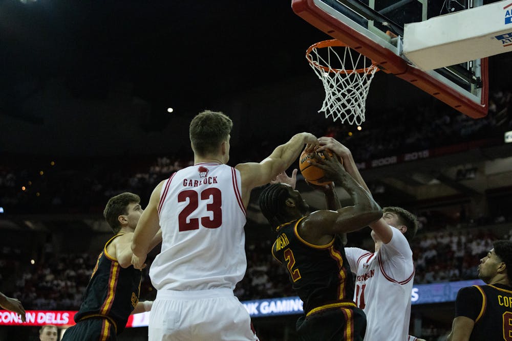 Forwards Will Garlock and Nolan Winter block a layup during Wisconsin men's basketball's 73-71 loss to the USC Trojans at the Kohl Center on Sunday, Jan. 25, 2025.