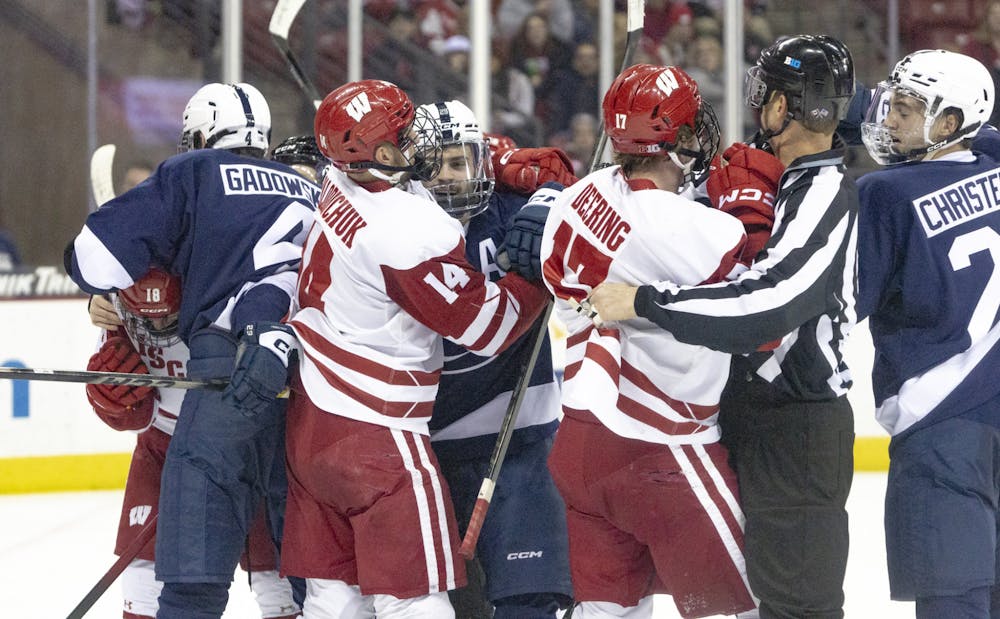 A scrum breaking out during the Badgers' 2-7 loss to Penn State in the Kohl Center on Friday, Jan. 23, 2025.