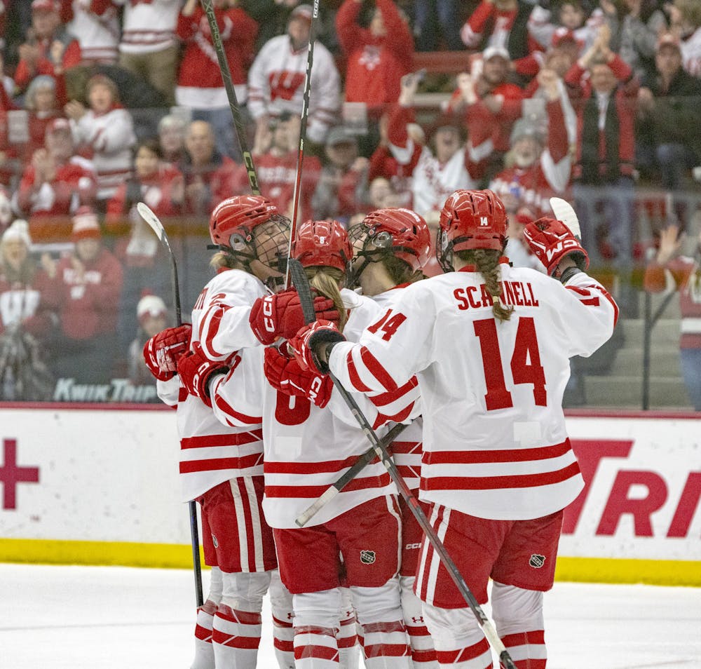 The Badgers celebrate their loan goal of Wisconsin women's hockey's 4-1 upset loss in LaBahn Arena to the Ohio State Buckeyes on Saturday, Feb. 7, 2026.