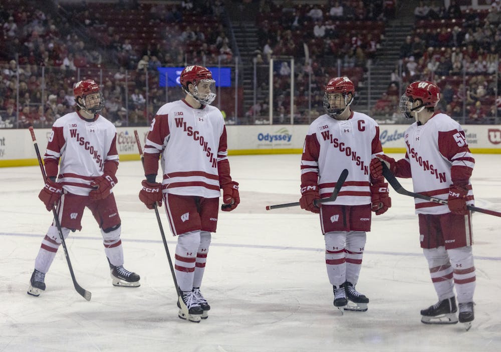 Badgers converse before a faceoff in the second period of the Badgers' 2-7 loss to Penn State in the Kohl Center on Friday, Jan. 23, 2025.