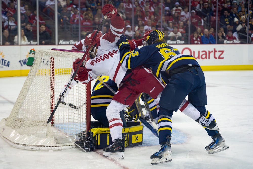Michigan's Luca Fantilli shoves Wisconsin forward Simon Tassy into the net during Wisconsin men's hockey's 1-3 defeat at the hands of the second-ranked Michigan Wolverines in the Kohl Center on Saturday, Feb. 21, 2026.