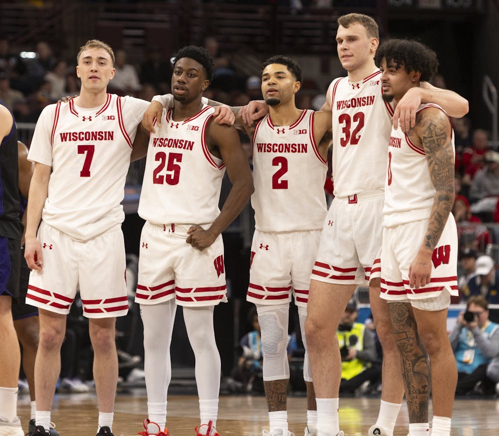 The Badgers men's basketball team watches a Husky shoot free throws during their 85-82 victory over Washington in round one of the Big Ten Men's Basketball Tournament on Thursday, March 12, 2026.