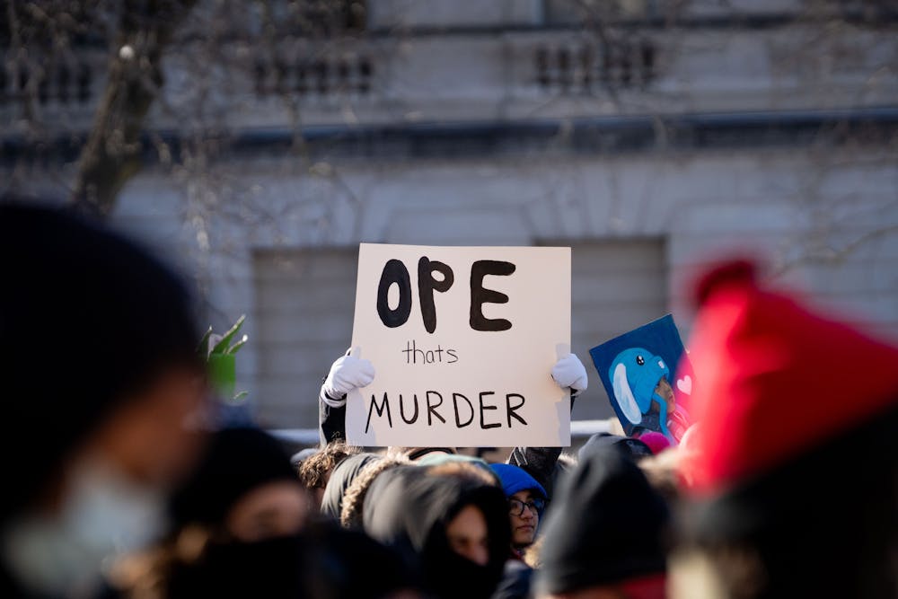 A protestor holds a sign saying "Ope thats murder" at the ICE Out March on Friday, Jan. 30, 2026.