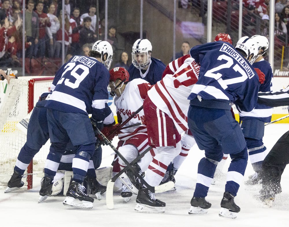 A scrum breaks out near the net in the Badgers' 2-7 loss to Penn State in the Kohl Center on Friday, Jan. 23, 2025.
