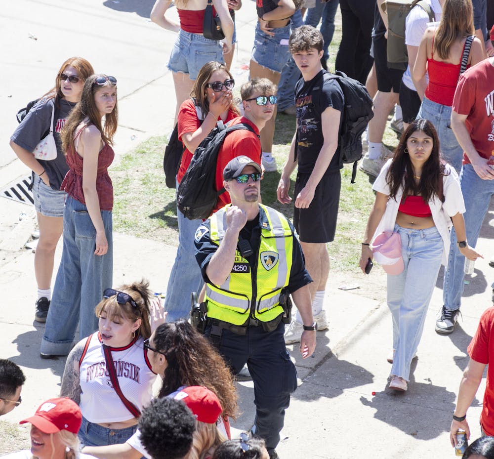 A police officer tells people to stop shooting a water gun off of their balcony during the 2026 Mifflin Street Block Party.