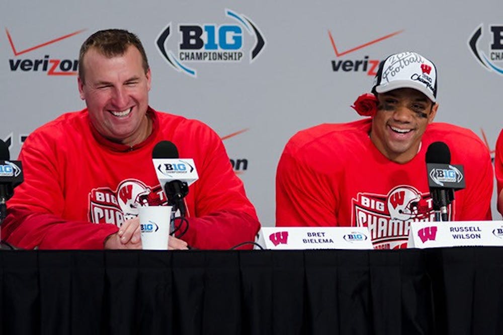 Wisconsin head coach Bret Bielema laughs with Russell Wilson at the press conference after the win.