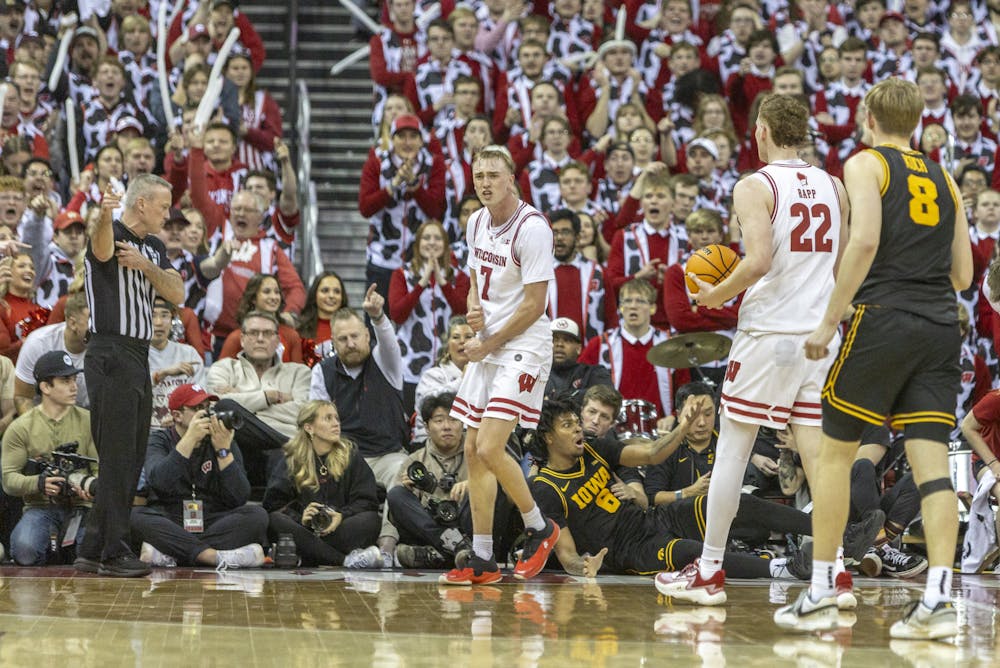 Guard Andrew Rohde celebrates during Wisconsin men's basketball's 84-71 victory over Iowa in the Kohl Center on Sunday, Feb. 22, 2026.