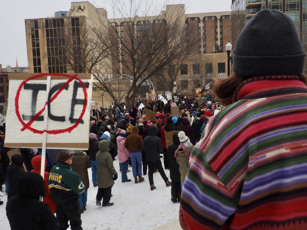 Protesters gather at an anti-ICE protest at the Wisconsin State Capitol on Sunday, Jan. 25, 2025.