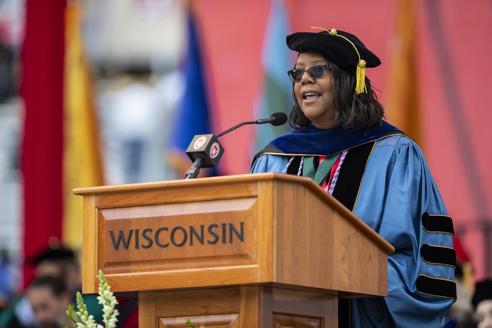Linda Scott, dean emerita of the University of Wisconsin—Madison School of Nursing, confers degrees during the UW–Madison's spring commencement ceremony at Camp Randall Stadium at the University of Wisconsin–Madison on May 13, 2023. The outdoor graduation was attended by more than 7,500 bachelor’s, master’s and law degree candidates, plus their guests. (Photo by Taylor Wolfram / UW–Madison)
