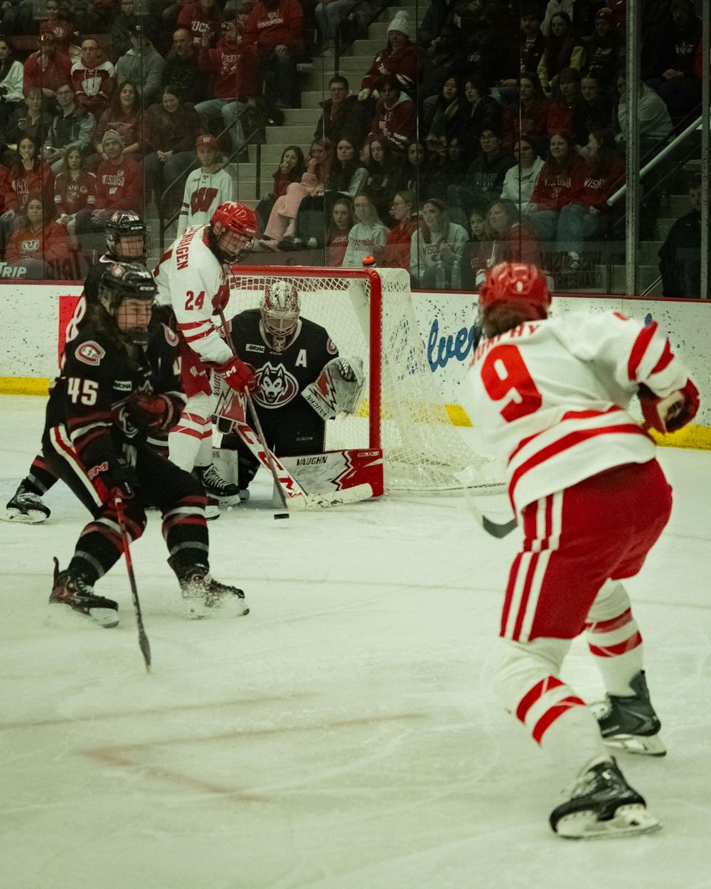 Defender Ava Murphy takes a shot during Wisconsin women's hockey's 9-2 demolition of St. Cloud State on Saturday, Feb. 21, 2026.