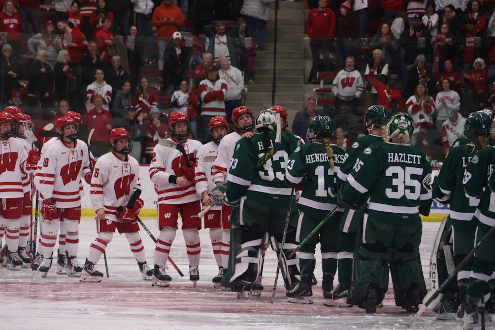 The Badgers and Beavers shake hands after No. 1 Wisconsin women's hockey's 3-2 series clinching OT win over Bemidji State on Saturday, Feb. 28, 2026.