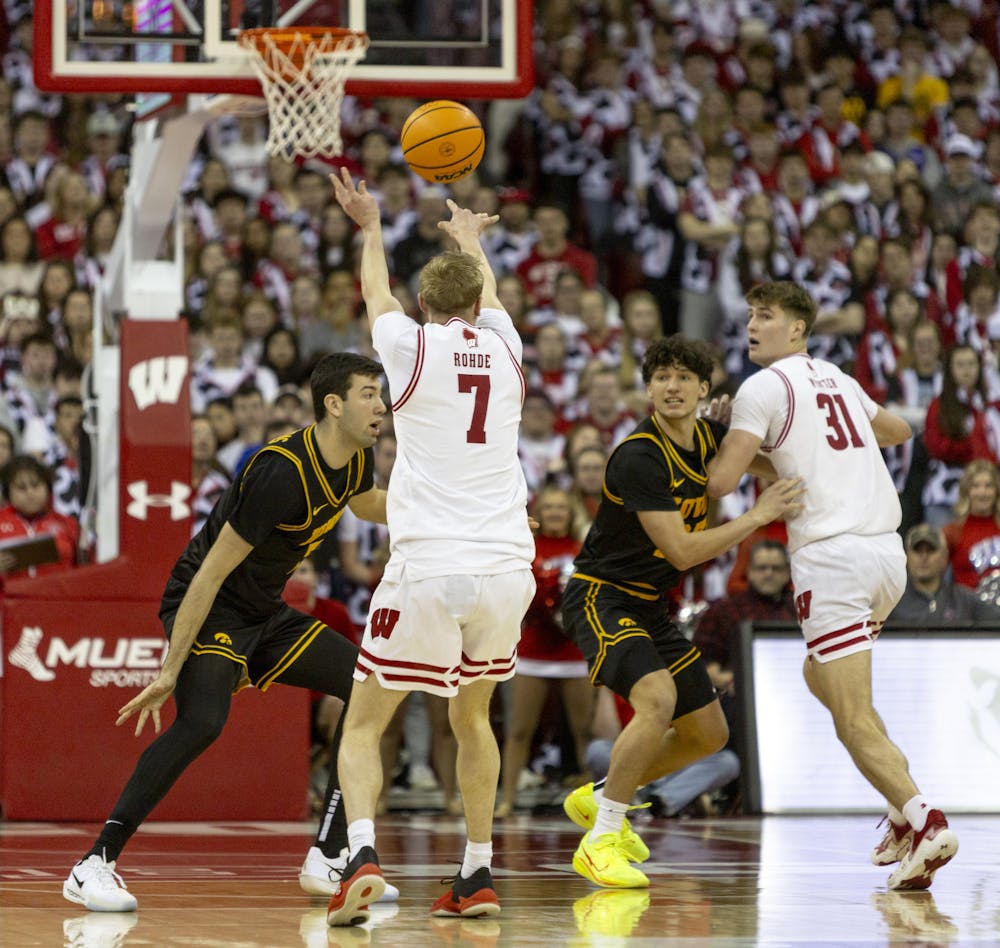 Guard Andrew Rohde throws a lob to forward Nolan Winter during Wisconsin men's basketball's 84-71 victory over Iowa in the Kohl Center on Sunday, Feb. 22, 2026.