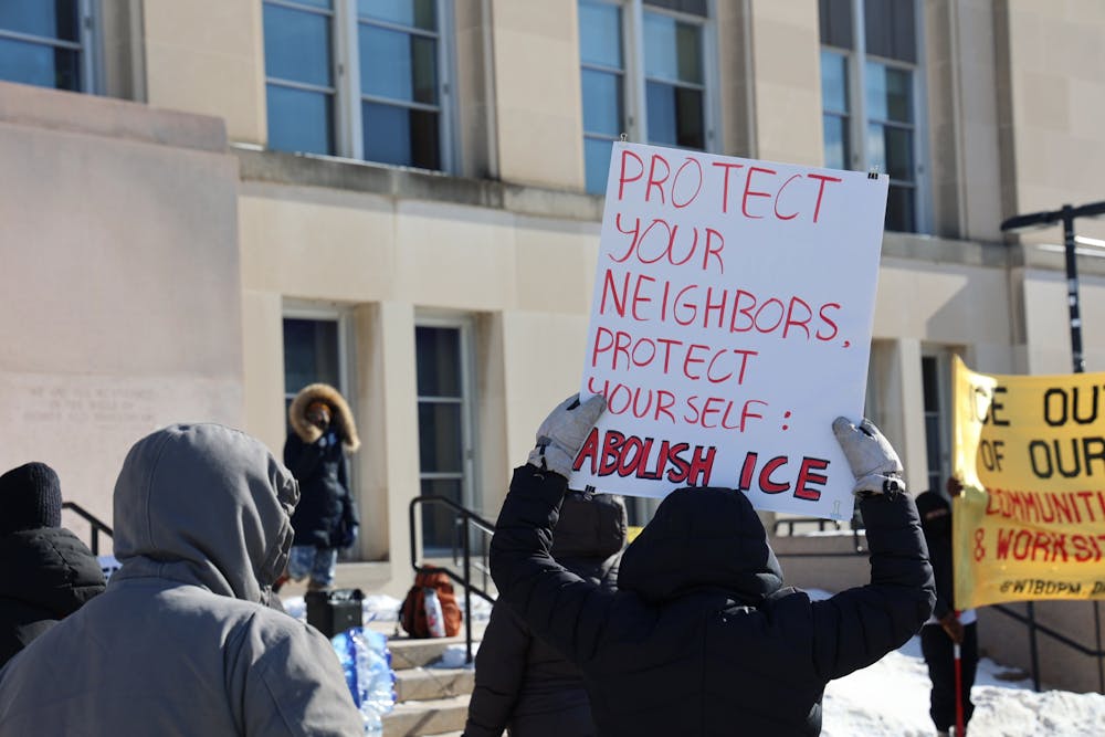 A protestor holds up a sign saying "Protect your neighbors. Protect yourself: Abolish ICE" at the ICE Out of Our Communities Rally on Library Mall on Friday, Jan. 30, 2026.