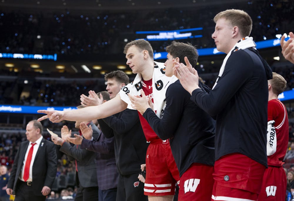 The Wisconsin bench celebrates a made basket during their heartbreaking 68-65 loss to Michigan in the Big Ten Tournament semifinal.