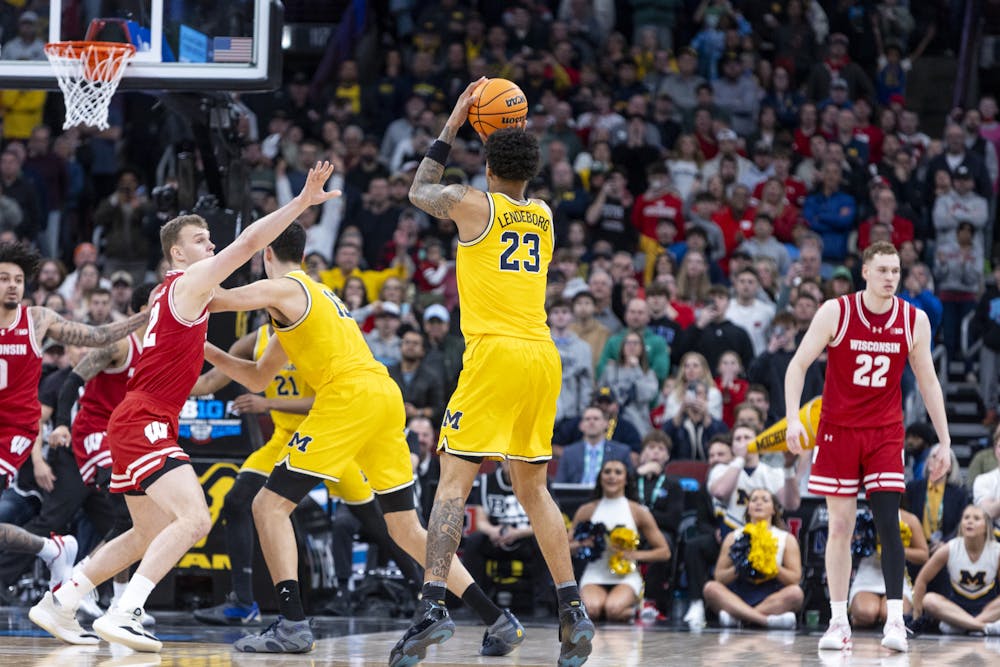 Yaxel Lendeborg takes the game-winning three pointer at the end of the Wisconsin Badgers men's basketball team's heartbreaking 68-65 loss to Michigan in the Big Ten Tournament semifinal.