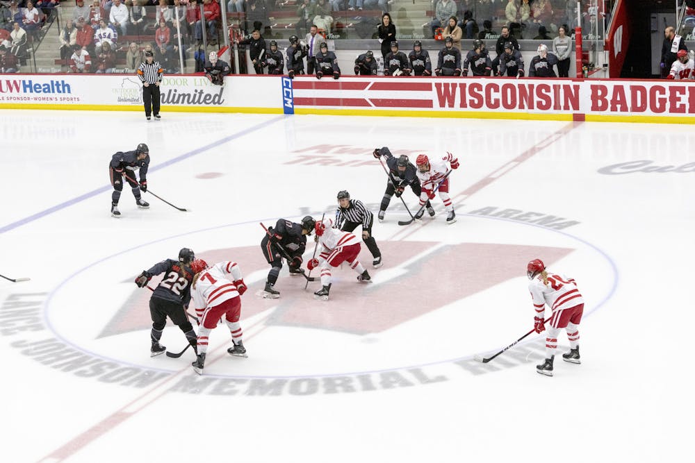 Both teams ready for a faceoff at center ice during Wisconsin women's hockey's 4-1 upset loss in LaBahn Arena to the Ohio State Buckeyes on Saturday, Feb. 7, 2026.