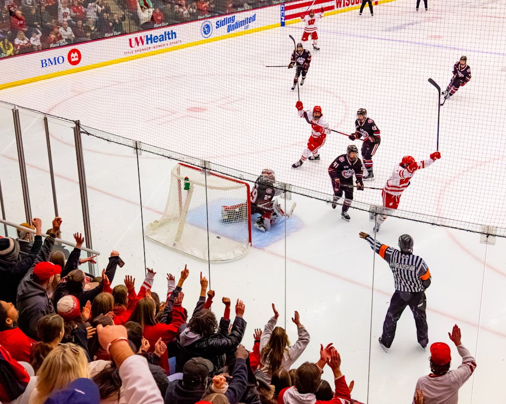 Wisconsin players celebrate a goal during Wisconsin women's hockey's 9-2 demolition of St. Cloud State on Saturday, Feb. 21, 2026.