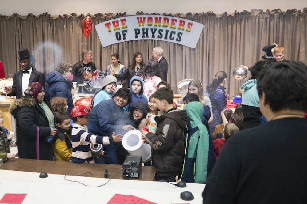 Children fire an air vortex cannon at the 2023 edition of the Wonders of Physics show.