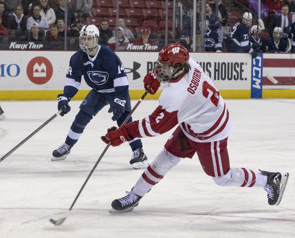Luke Osburn takes a shot in the Badgers' 2-7 loss to Penn State in the Kohl Center on Friday, Jan. 23, 2025.