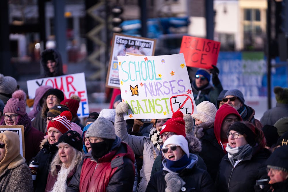 A protestor holds a sign saying "School nurses against ICE" at the Madison Nurses Protest on Friday, Jan. 30, 2026.