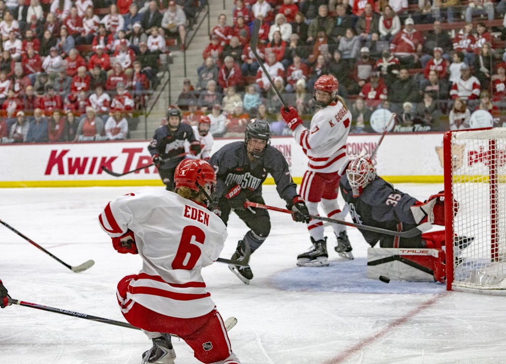 Captain Lacey Eden takes a shot in Wisconsin women's hockey's 4-1 upset loss in LaBahn Arena to the Ohio State Buckeyes on Saturday, Feb. 7, 2026.