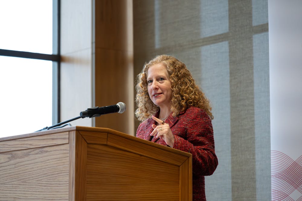 Chancellor Jennifer Mnookin introduced former NBC News CEO Andy Lack at the Pyle Center on Thursday, March 5, 2026.