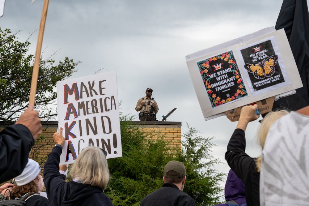 A Cook County police officer surveys a protest site from a rooftop during anti-ICE demonstrations outside the Broadview ICE facility in Illinois on Oct. 10, 2025.