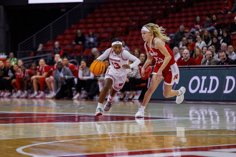 Guard Ronnie Porter drives toward the paint during the 63-60 upset win over #24 Nebraska in the Kohl Center on Wednesday, Jan. 21, 2026.
