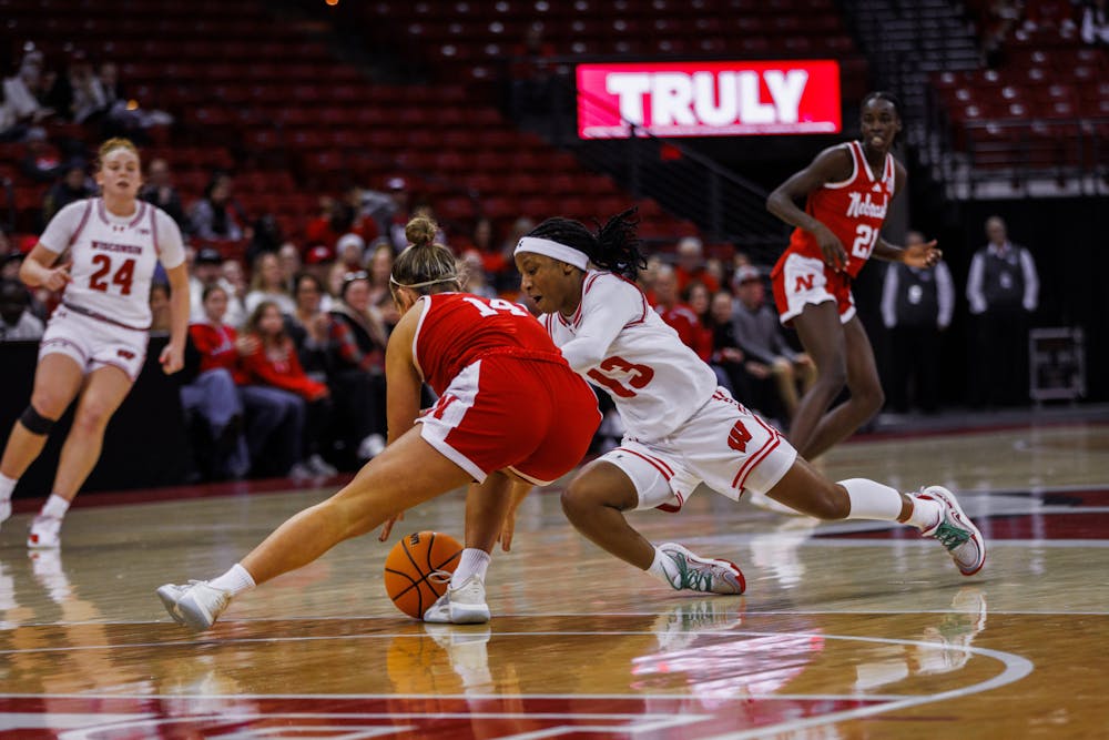 Guard Ronnie Porter scrambles for a loose ball during the 63-60 upset win over #24 Nebraska in the Kohl Center on Wednesday, Jan. 21, 2026.