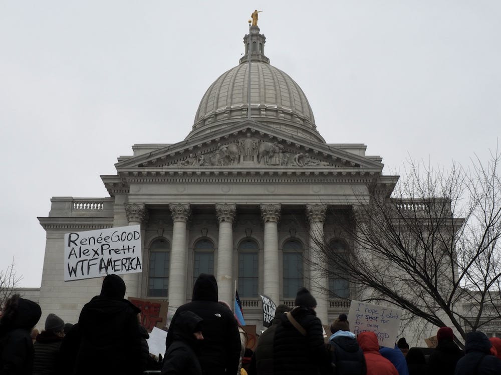 Protesters gather at an anti-ICE protest at the Wisconsin State Capitol on Sunday, Jan. 25, 2025.