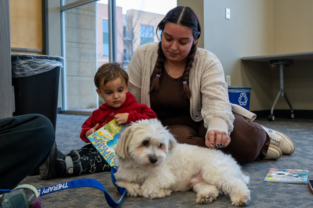 A kid reads at Sequoya Library's "Read to a Dog" event, meant to help children get more comfortable reading out loud, on Thursday, Feb. 5, 2026.