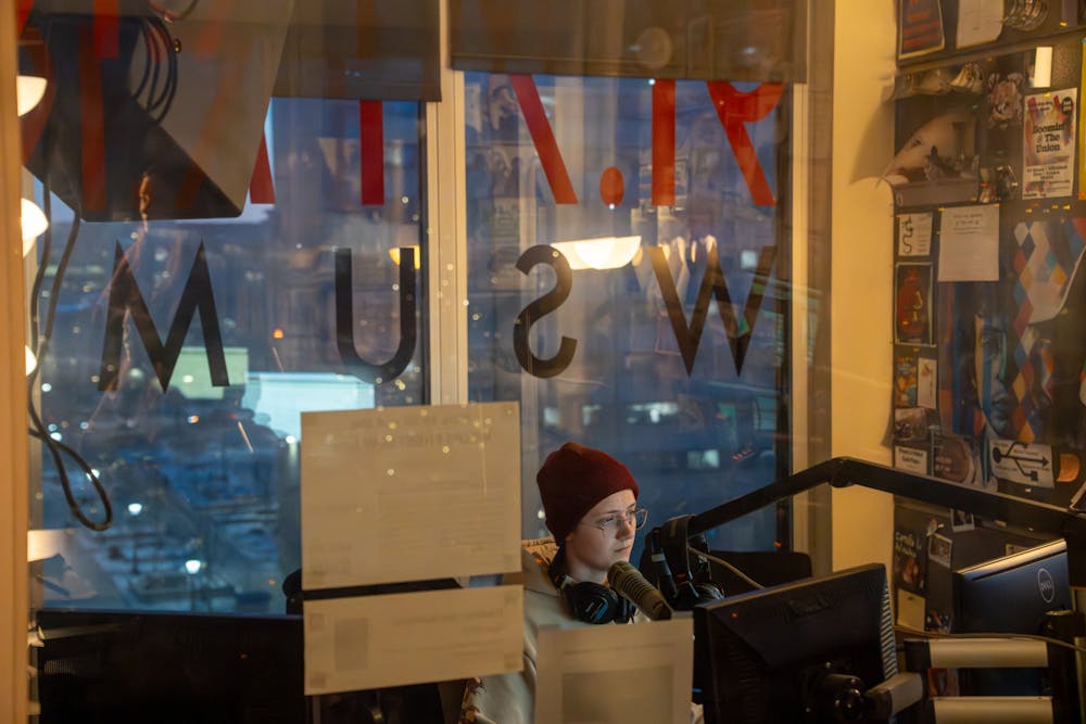 A student hosting a radio show on WSUM's 91.7 FM Station on Jan. 29, 2026.