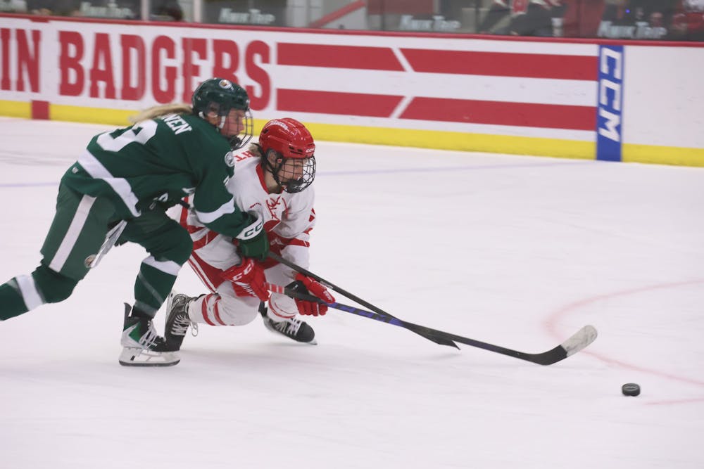 Forward Claire Enright fights for a puck during No. 1 Wisconsin women's hockey's 3-2 series clinching OT win over Bemidji State on Saturday, Feb. 28, 2026.