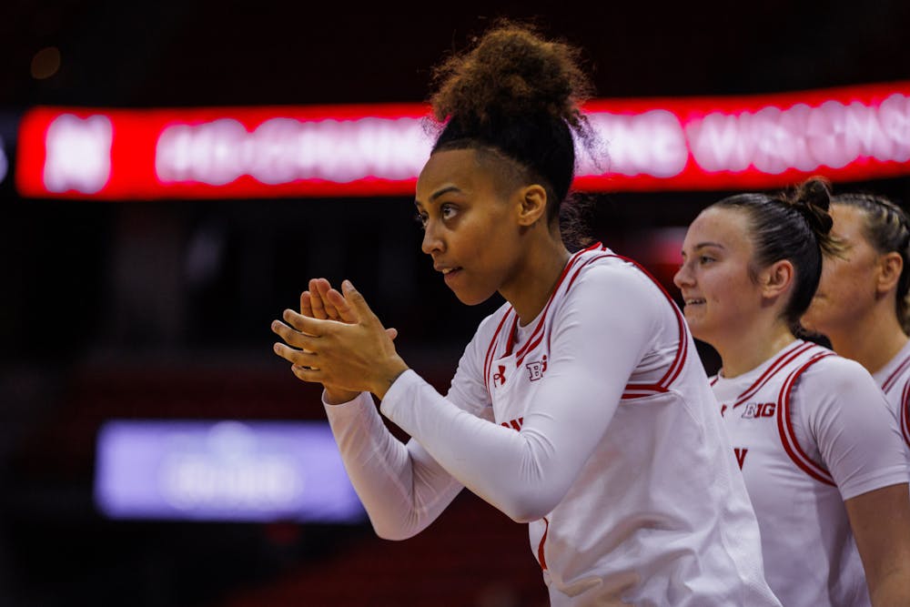 Guard Destiny Howell applauds her team during the 63-60 upset win over #24 Nebraska in the Kohl Center on Wednesday, Jan. 21, 2026.