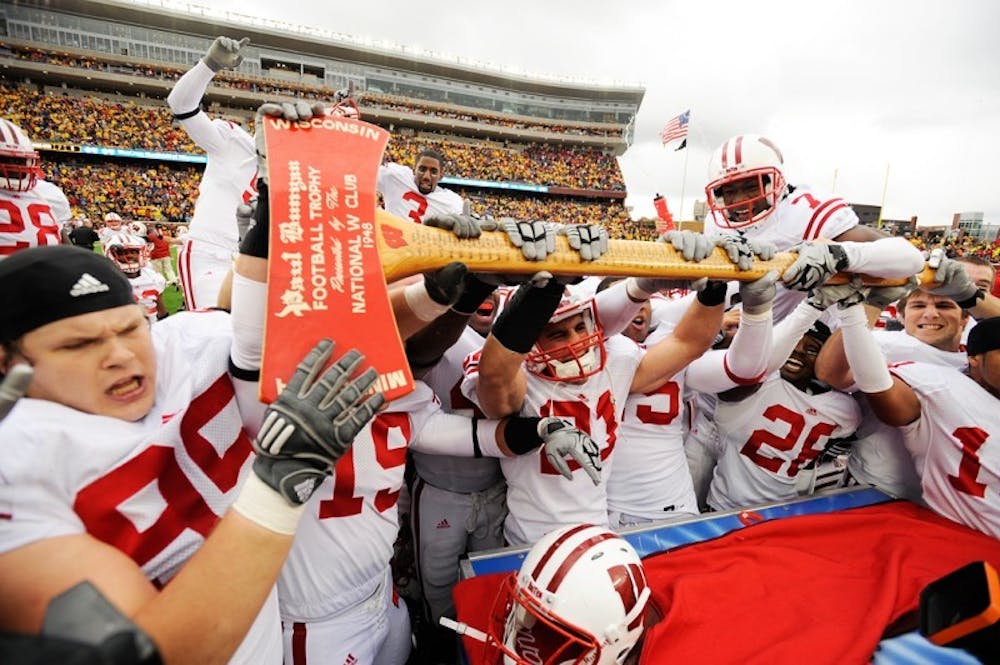 axe: Wisconsin players celebrate defeating Minnesota and keeping Paul Bunyan's Axe