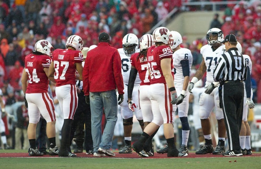 Nick Toon's father, Al Toon, took part of the coin flip. Toon wore his father's jersey, 87, for the game vs the Penn St Litany Lions in Camp Randall, 26 Nov 2011.