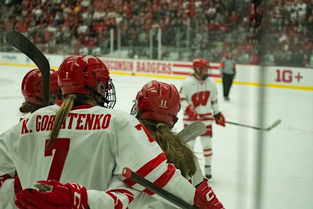 Wisconsin players come together after a goal during Wisconsin women's hockey's 9-2 demolition of St. Cloud State on Saturday, Feb. 21, 2026.