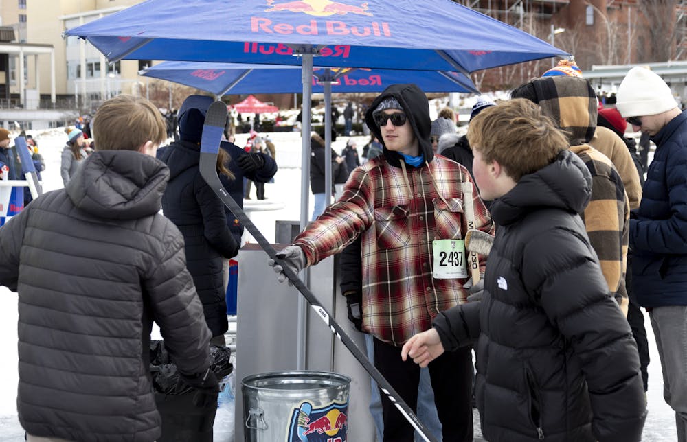 A man hands out hockey sticks at the Winter Carnival on Lake Mendota on Saturday, Feb. 7, 2026.