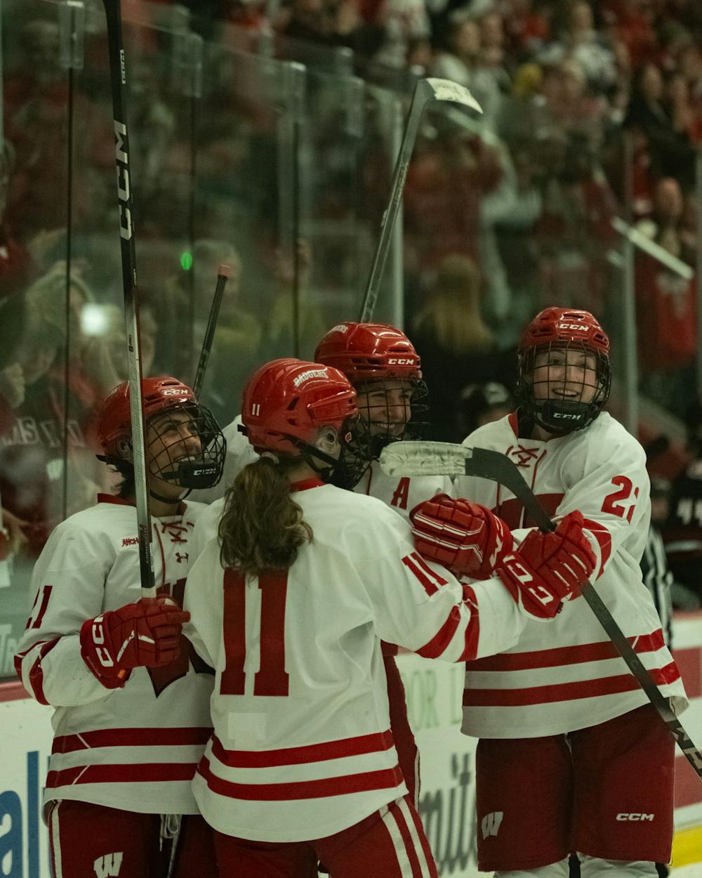 Wisconsin players celebrate a goal during Wisconsin women's hockey's 9-2 demolition of St. Cloud State on Saturday, Feb. 21, 2026.