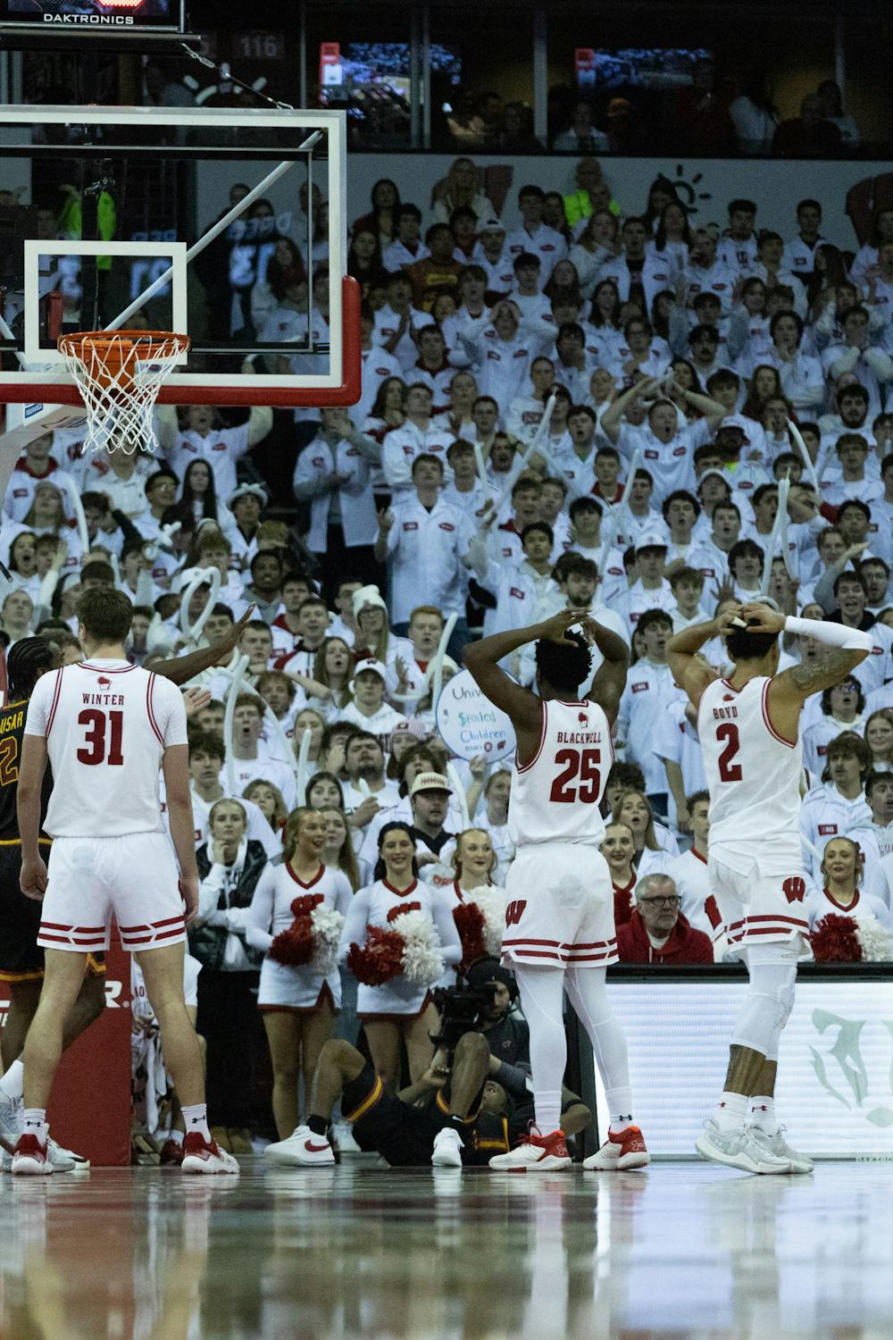 Nick Boyd and John Blackwell hold their hands on their heads during Wisconsin men's basketball's 73-71 loss to the USC Trojans at the Kohl Center on Sunday, Jan. 25, 2025.