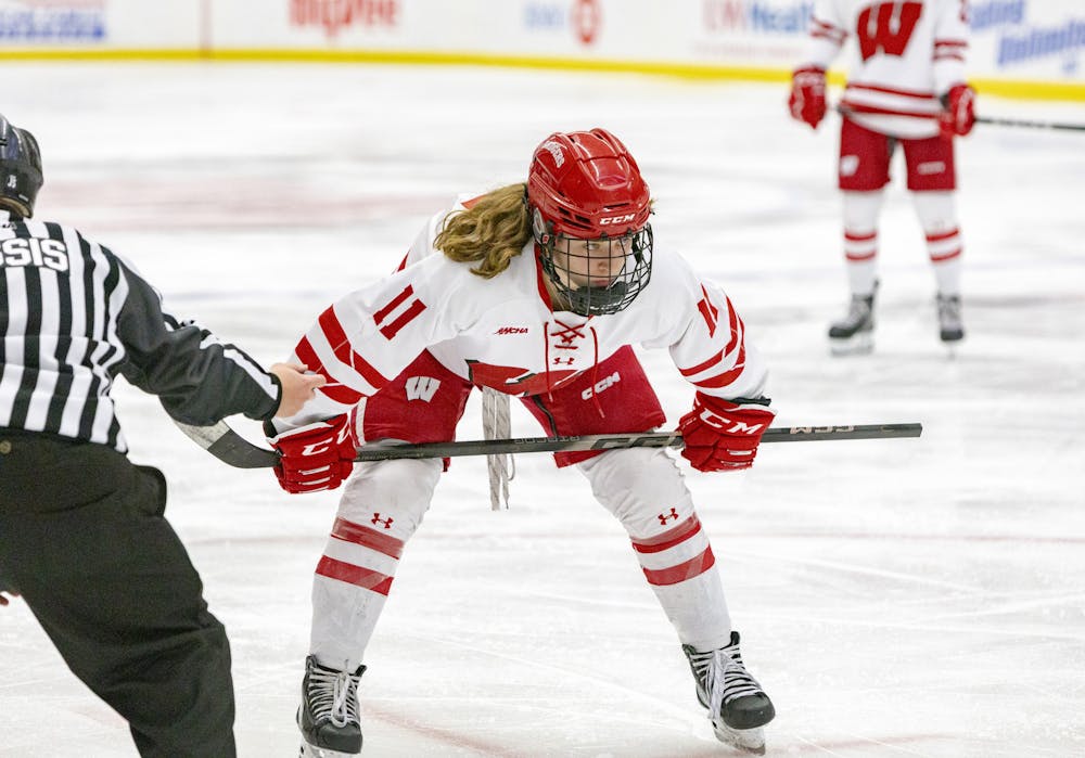 Forward Cassie Hall readies herself for an offensive zone draw during Wisconsin women's hockey's 4-1 upset loss in LaBahn Arena to the Ohio State Buckeyes on Saturday, Feb. 7, 2026.