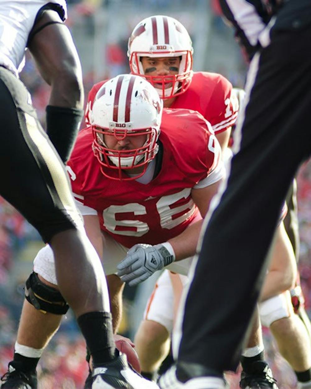 UW Badger redshirt junior Peter Konz gets ready to snap the ball to redshirt senior quarterback Russell Wilson.