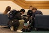 Graphic by Eloise Guth, Top left: Students work together to cook meals in the Wolf Teaching Kitchen during the grand opening of the Bakke Recreation & Wellbeing Center at the University of Wisconsin–Madison on Sept. 22, 2023. (Photo by Althea Dotzour / UW–Madison), Top right: A shelf of books at College Library on October 19, 2024 in Madison, Wis. (Nicholas Duda), Bottom middle: The Marquee Theatre at Union South offers free film screening for UW-Madison students. (Maggie Spinney)